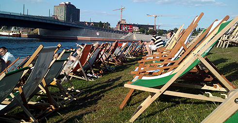 Siguiendo el sinuoso curso del Spree hacia el oeste está la BundesPresse-Strand (Kapelle-Ufer 1). Cuenta con un amplísimo programa de actividades y en ella es posible desde practicar voley playa hasta echarse unos bailes al caer la tarde. El público es variado: locales, turistas y ejecutivos se dejan ver por allí mientras se refrescan. Seguimos hacia el oeste y llegamos a nuestro destino final, la Hauptstadt-Strand (Ludwig-Erhard Ufer). Con césped en vez de arena y varias filas de tumbonas, tiene vistas a la estación de trenes Hauptbahnhof y está a tiro de piedra del Reichstag y el complejo de edificios gubernamentales levantado tras la caída del Muro.